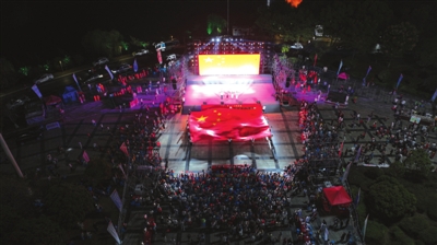 活动在迎风飘扬的五星红旗中拉开帷幕。千名市民队形整齐,通过多样组合,排列出“75”“五星红旗”等喜庆庄严的图案。最后由两千市民牵着五星红旗沿着人群缓缓展开,为新中国华诞送上深情祝福。