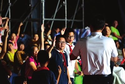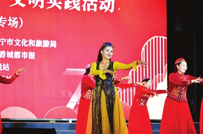 “社区才艺秀”环节,多才多艺的居民自编自导了舞绸龙、黄梅戏、新疆舞、旗袍秀等14个精彩节目上场。为社区群众带来了一场精彩纷呈的视觉盛宴。尤其是《舞绸龙》节目风格迥异、赏心悦目。来自咸宁市阳光少年护旗队的五年级小学生张紫琪,声情并茂地向在场的近万名观众宣讲《童心护国旗》,赢得了阵阵掌声。