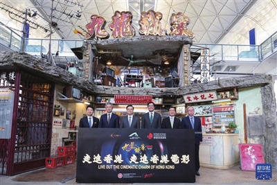 本报综合消息 香港国际机场接机大厅,一座约6.5米高的双层旧建筑物屋顶亮着“九龙城寨”霓虹灯牌,吸引许多旅客驻足欣赏。7日,以“走进香港 走进香港电影”为主题的展览在香港国际机场举行开幕仪式,电影《九龙城寨之围城》多个拍摄场景一一重现。