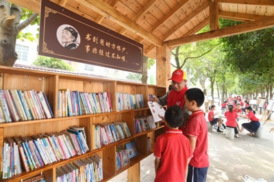 9月26日,咸安区向阳湖镇广东畈小学新建设的户外“跑山电工”图书驿站前,来自国网咸宁市咸安区供电公司党员服务队的志愿者与80余名小学生一起开展“书香校园,爱国有我”主题活动。