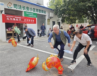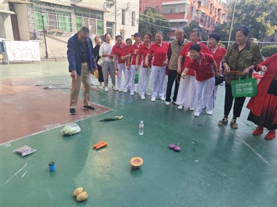 10月10日,咸安区温泉街道万年路社区开展“九九重阳节 浓浓敬老情”主题活动。活动现场,社区为老年人量身定制“投壶挑战”“赶鸡入笼”趣味游戏,丰富精神文化生活,促进邻里友爱。同时,还为居民们讲解反电信诈骗等知识。 (记者陈志茹 通讯员马赟)