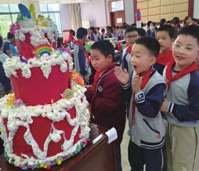 有为祖国母亲庆生的独特生日大蛋糕,由废旧纸壳为底、装饰纸裁剪而成的花朵点缀着“蛋糕”,体现了绿色环保意识,也体现了学生的创新思维。