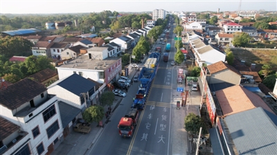 本报讯(记者庞赟 毛亚轩 通讯员张敏)10月24日下午4时30分许,G107咸安区贺胜桥镇,随着一阵阵警示鸣笛声,一辆总长86.22米、宽5.1米、高5.15米、车货总质量582.8吨的大件运输车辆从武汉方向缓缓驶来。