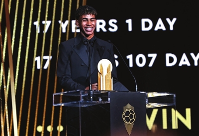 本报综合消息 2024年金球奖颁奖典礼28日晚在巴黎夏特莱剧院举行,西班牙足球成为当晚的最大赢家——罗德里与邦马蒂分别荣获男、女足金球奖,17岁的亚马尔摘得象征最佳年轻球员的“科帕奖”。
