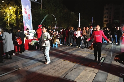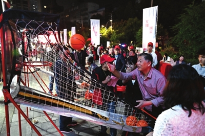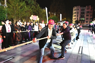 趣味运动会上,拔河、跳绳、投篮、吃桔子比赛等轮番上阵,老少居民们齐齐参与,加油声、呐喊声响彻夜空。运动场里带着满满的欢乐,广场里瞬间成了健身场,欢呼声此起彼伏。
