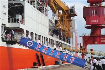 17日,拥有最大11000米的钻深能力、我国自主设计建造的首艘大洋钻探船“梦想”号在广州正式入列。 (据新华社)