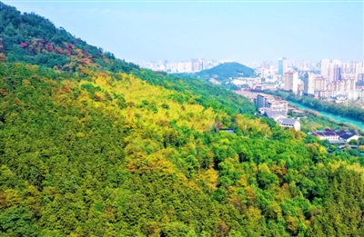 近日,航拍镜头下的潜山森林公园层林尽染,色彩斑斓。初冬时节,潜山上的400多种树木开始变红、变黄,各种色彩交织在一起,与淦河的碧水、城市的高楼交相辉映,将香城泉都装扮得格外秀美。