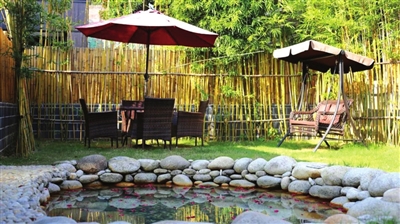 春泉庄温泉在设计中保留自然环境的原始生态风貌,43个泡池依地形错落有致,隐卧在原生树木和山石的怀抱之中,四周田野风光尽收眼底。