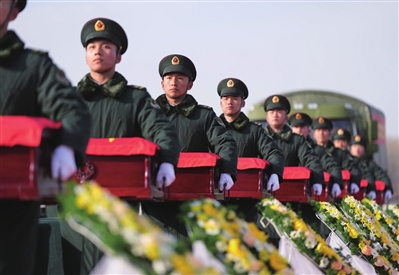 新华网消息 第十一批在韩中国人民志愿军烈士遗骸迎回仪式28日在沈阳举行。43位志愿军烈士遗骸及495件遗物由我空军专机从韩国接回至辽宁沈阳,回到祖国怀抱。