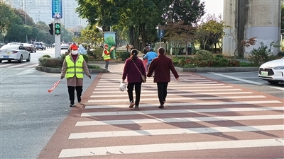 如今,在交通劝导员的劝导下,行人、非机动车辆过马路时会自觉遵守交通规则,按交通信号通过斑马线,不争道抢行,做到“一停二看三通过”。