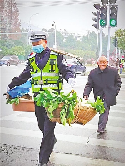 徐晓波当时是交通协管志愿者,他介绍,菜篓子是后面老爹爹的,他好像想闯红灯,红灯还有十几秒,交警将爹爹拦住,接下老人肩上的扁担,叫他绿灯亮了再走,顺势就把扁担挑在了自己肩上。绿灯亮了,交警丝毫没犹豫,挑着扁担带着老爹爹一前一后通过了斑马线。