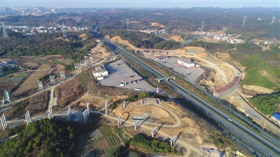 12月16日,记者在咸宁南外环高速公路高赛枢纽建设现场看到,一排排高架立柱拔地而起,连通咸通高速的路线清晰可见。