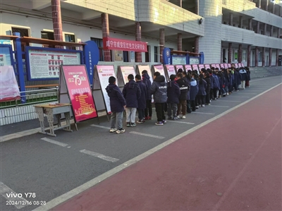 同学们围在展板前,聆听解说,眼神中充满了对历史的敬畏和对先烈的敬仰。他们时而陷入沉思,时而轻声交流,仿佛在与历史对话,感受着红色精神的力量。