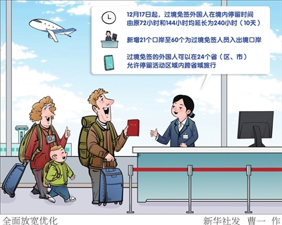 国家移民管理局12月17日宣布,即日起将过境免签外国人在境内停留时间由原72小时和144小时均延长为240小时(10天),新增21个口岸至60个为过境免签人员入出境口岸,过境免签的外国人可以在24个省(区、市)允许停留活动区域内跨省域旅行。