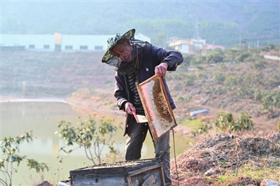乐昌海介绍:“我养了100多箱本土中蜂,大概能产2000多斤枇杷蜜,收入大概有8万元。”