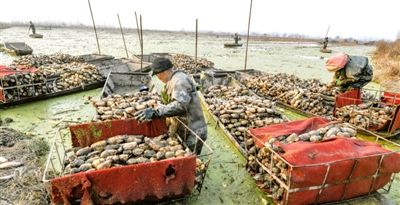 1月2日,嘉鱼县陆溪镇鸿富农产品加工股份有限公司官洲莲藕基地,挖藕机隆隆作响,运藕船来回穿梭,当天共有3万公斤莲藕装车,运往车间加工。
