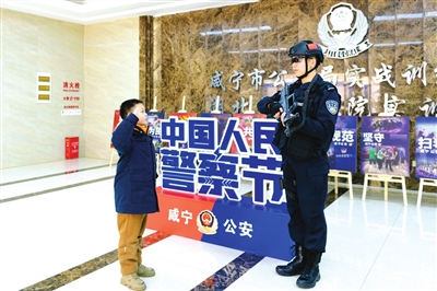在实战训练中心大楼前,当突击车、咸警铁骑等警用特种车辆映入眼帘时,各位嘉宾纷纷围着警用车辆和民警们合影留念。另一边,炫酷的警用武器器械引得小朋友争相上手体验。