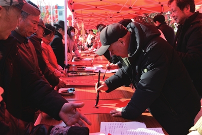 在精彩的文艺表演之外,活动现场还设置了一系列丰富多彩的文化活动,其中最引人注目的莫过于当地书法家的现场创作与春联赠送。只见几位书法家挥毫泼墨,笔走龙蛇,一幅幅寓意吉祥的春联跃然纸上。村民们纷纷围拢过来,争相领取这份来自传统文化的祝福。有的村民小心翼翼地捧着刚写好的春联,脸上洋溢着幸福的笑容;有的则与书法家交流起书法心得,现场气氛温馨而热烈。