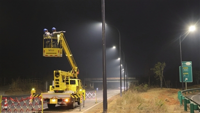 ??? 1月21日,随着最后一个电源点送电调试完毕,市民群众期盼已久的泉都大道路灯全线点亮。(通讯员? 袁恒)