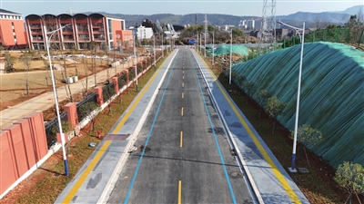 新建道路宽阔整洁,道路两旁路灯整齐划一,蓝底白字的道路标识牌已经竖起,草皮、树木等景观给道路增色不少。