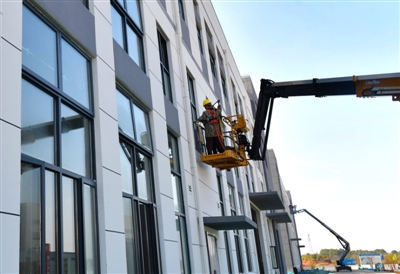 2月18日,咸安经济开发区东湖高新咸安产业园,工人们正在进行厂房外立面装修。