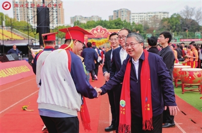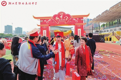 此刻,春风掠过操场上空,百日誓师的横幅猎猎作响。孩子们携手家长踏上红毯,依次穿过象征责任与担当的“成人门”“成才门”,舞龙分列在两道门口,给孩子们送去“跃龙门”的美好祝愿。校领导列队为孩子们成年而祝福,为高考加油。一个击掌、一个微笑,都承载着学校对同学们的美好祝愿。