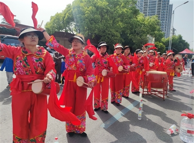 红绸翻飞、鼓乐铿锵……在咸安区政府门口点位,腰鼓队的队员们用热情的舞姿与激昂的鼓点为选手们鼓劲,表演充满活力,为比赛增添了欢乐氛围。