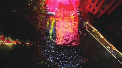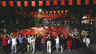10月1日晚,国庆假期首日,在咸宁城区月亮湾街区,一场集文化、音乐、美食、休闲于一体的假日盛宴正式开启。当熟悉的《我和我的祖国》旋律响起,过往市民与游客自发加入,还有来自民间团队、个人自发的艺术表演穿插其中。当市民群众与工作人员合力托举着长约10米的巨幅国旗穿过人群时,整个街区瞬间被炽热的家国情怀点燃。 (记者毛亚轩/摄)