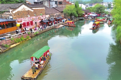 溪流上的划船项目成为游客喜爱的旅游项目。竹筏在清澈的河面上往来穿梭,孩子们兴奋地撩拨着清凉的河水,情侣们悠闲地欣赏两岸风光。