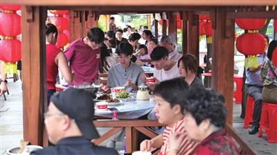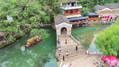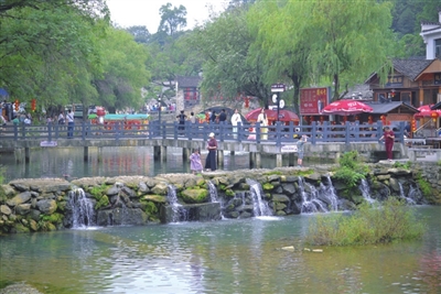 时至正午,河水旁十余家农家乐座无虚席。后厨灶火旺盛,大铁锅里翻滚着当地特色菜,农家土鸡汤、小河虾炒韭菜、井水豆腐、红薯圆子等。游客们吃了都赞不绝口。