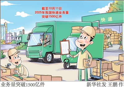 新华网消息记者12日从国家邮政局获悉,根据国家邮政局监测数据显示,截至10月11日,2025年我国快递业务量突破1500亿件,比2024年提前37天。