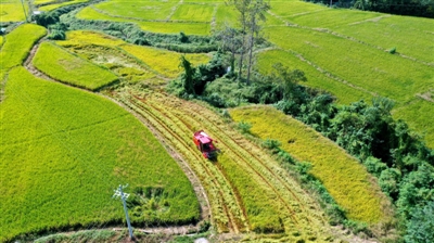 9月27日,崇阳县石城镇八一村,农机手正驾驶收割机驰骋在金黄的田野里,忙着收割水稻。眼下,我市水稻陆续成熟,村民们正趁着好天气抓紧抢收,田野里呈现一派繁忙景象。(记者夏正锋)