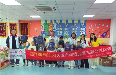 下午3点,活动准时开始。首先,饶刚总经理代表公司向康复中心捐赠了“百年星辰”书包套装。这些满载关怀的物资,传递着百年人寿对自闭症儿童的温暖牵挂。