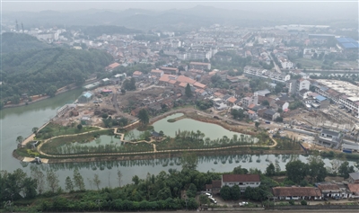 10月10日,咸安汀泗桥红色文化旅游区项目建设现场,东西街外立面正在进行改造,街道配套地下管网建设工程正在施工。