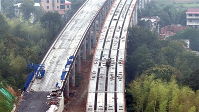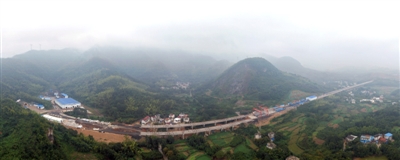 10月15日,咸宁城区南外环高速公路(咸宁桂花至汀泗高速公路)项目现场,部分横梁已经架起,工人们正在有序施工。