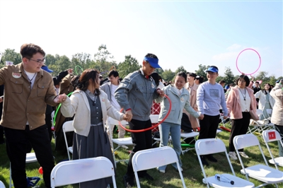 “相识破冰”环节随即展开。全场嘉宾搭肩齐跳兔子舞,陌生感在欢笑中消散;舞蹈《生在桂乡爱桂花》柔美上演,抛绣球互动增添趣味;“击鼓传花”游戏中,幸运嘉宾登台自我介绍,现场掌声不断。