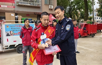 当天,咸宁市公安局咸安区分局浮山派出所所长钱兵走进快递网点,将四份沉甸甸的“反诈先锋”荣誉证书和定制“警察小熊”,逐一递到四位表现突出的快递员手中。