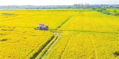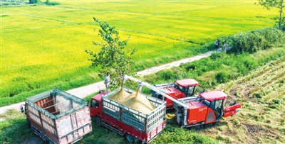 2017年,返乡创业的陈国祥承包了村里的500余亩土地,改造成良田,运用科学的田间管理,产量逐年提升,预计今年亩产量可达650公斤,目前正有序抢收,确保颗粒归仓。
