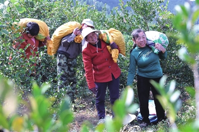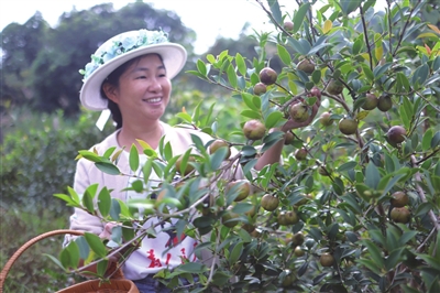 10月28日,位于通山县燕厦乡北冲村的300亩油茶林,迎来一年中最富足的采收季。青红相间的油茶果挂满枝头,数十名妇女肩挎竹篓,穿梭于层叠的茶林间,今年采收油茶果突破5万斤。2023年,该基地以其“科技引领、巾帼建功”的突出成效,成功获评“全国巾帼现代农业科技示范基地”。