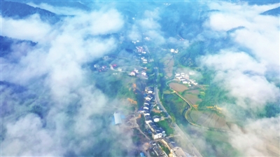 10月28日早晨,通山县九宫山镇牌楼村一带,云海在山峦间翻涌,青山、道路、民居、田野在云雾中若隐若现,秀美如画。