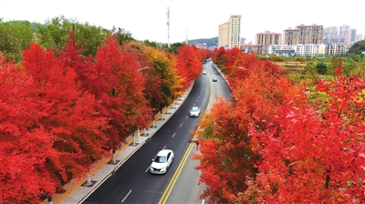 眼下正值枫叶观赏期,在市区孟养浩东路,道路两旁的枫树已悄悄染红,层层叠叠的枫叶在阳光照射下呈现出绚丽夺目的色彩,勾勒出一幅诗意盎然的“枫景”,吸引众多市民游客打卡拍照,沉浸式享受初冬浪漫。 (记者赵忠志)