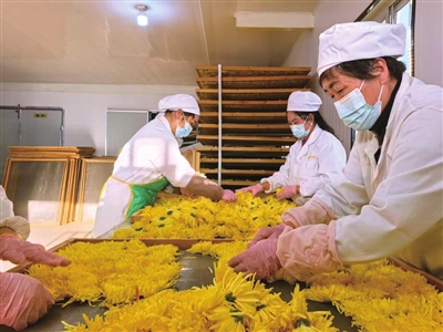 “我们第一批菊花从11月中旬开始采摘,预计这轮采收期持续10天左右。”湖畔村党支部书记程国柱介绍,当前每天组织15至20名工人进行采摘,日均采收量约200筐。为保证菊花品质,采摘后的鲜花会在当天运至村内烘干厂房,经过约90小时的精细烘干处理后,最终以该村自主创立的“湖畔村”品牌礼盒走向市场,完成从田间到产品的转化。