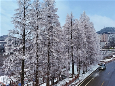 近日,随着气温下降,九宫山迎来雾凇景观,漫山松枝、水杉缀满凝霜,秋的余韵与冬的清冽在此交织,成为山间独特的风景线。