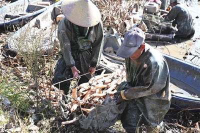 说话间,又一批刚采挖的野藕被运到塘埂边,藕农们默契地分工协作,分拣、装筐的动作一气呵成。为了保障采挖效率,基地每天都会聘请十余名周边村民,工钱按2元一斤结算,多劳多得的模式也大大调动了大家的积极性。“现在大家干活都有劲儿,不仅是为了挣钱,更是看着咱们本地的野藕越卖越远,心里都觉得自豪。”唐攀笑道。