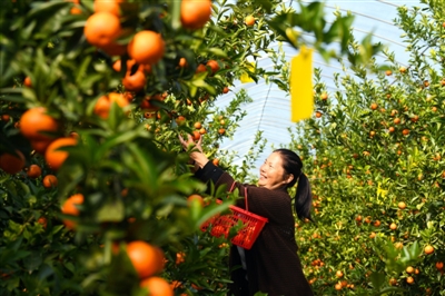 11月25日,嘉鱼新街镇嘉多宝生态果蔬专业合作社糖桔种植基地,一棵棵糖桔树上,火红的糖桔压弯枝头,负责人张梅芬正在为订单客户采摘糖桔。据了解,该合作社种植十几亩糖桔,目前果实已成熟,进入采摘期,最高亩产量近2000斤。