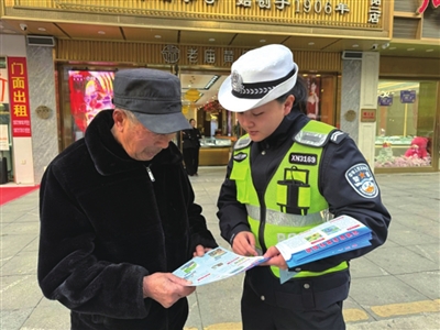 现场,民警还向过往行人发放反光贴、安全倡议书等物资,提醒大家冬季出行注意保暖的同时,更要牢记交通安全。
