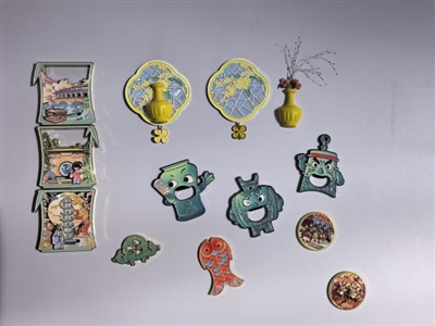 此外,三国题材“古城会”“长坂坡之战”冰箱贴分别演绎关羽与张飞重逢、曹操与刘备在长坂坡交战场景,龙型玉佩与清代雕花龛锁钮坠也化作小巧冰箱贴,让文物故事随手可触。