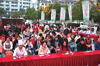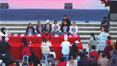 下午5时,“我爱我家”厨艺大赛率先点燃现场氛围。十一盘匠心烹制的家常菜肴依次陈列,香气四溢——肉香脆菇鲜香交融、合菜面筋道爽滑、兰花石榴鸡造型别致、灵蛇戏珠创意巧思、农家小炒肉香气扑鼻、松子鱼色泽诱人、椒盐基围虾咸香酥脆、蓝莓山药酸甜可口、酱香猪脚软糯弹牙、珍珠豆腐丸精巧玲珑、满载而归清爽嫩滑。经五位评委细心品评,一道兰花石榴鸡凭借精致的摆盘、经典的风味与扎实的烹功脱颖而出,荣获一等奖。“能和大家交流厨艺,把家里的味道分享给邻里,这份快乐比奖牌更珍贵。”获奖者吕玉荣喜悦地说道。