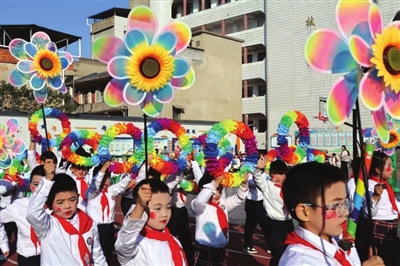 开幕式上,国旗队、鼓号队、彩旗队依次入场,各成员校代表队精神抖擞。团体操表演尤为亮眼:四年级“盛世花开”表演中,队员手持牡丹鲜花,队列变换呈现“1964”“2025”等数字,寓意学校砥砺前行;三年级“好彩”团体操中,小队员手持啦啦花球,时而组成花田,时而化作“春芽破土”,充满童真活力;五年级“美丽中国”表演创意十足,队员如彩蝶翩跹,动作整齐默契。各年级方阵展演后,家长代表队的“80年代”复古迪斯科表演将气氛推向高潮,家长们身着喇叭裤、花衬衫,踏着明快节奏起舞,尽显热情与情怀。
