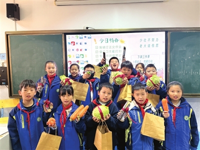 每一期兑换奖品各不相同,本期奖品别出心裁地设置为新鲜蔬菜。青菜、萝卜、番茄、青椒……各类色泽鲜艳的蔬菜琳琅满目。学生们纷纷表示,用自己的表现兑换蔬菜,为餐桌添一道菜,特别有成就感。